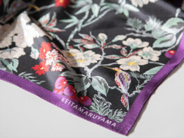 富岡製糸場の展示の中にあるいろんなモチーフを絵画タッチで仕上げた一枚。今回KEITA MARUYAMAとのコラボで実現した富岡オリジナルです。テーマは「スーベニア=お土産」。柄を見ているだけで富岡の歴史を辿ることができます。素材は富岡産100%のシルクに繊細なコットンを混紡していて、なめらかな触り心地とツヤ、ハリが特徴です。バンダナサイズに仕上げているので、カジュアルにもシックにも巻き方次第で楽しめます。